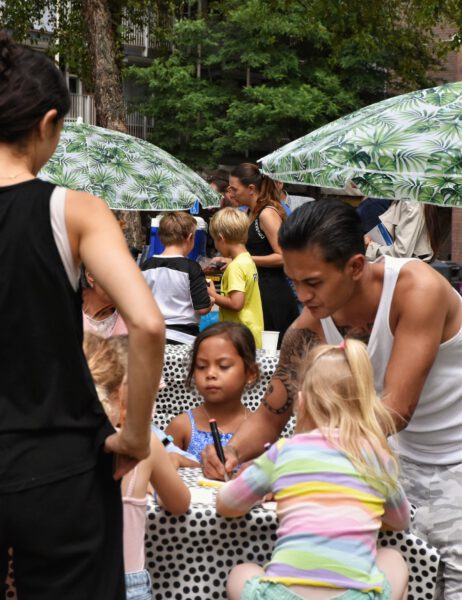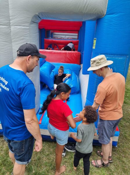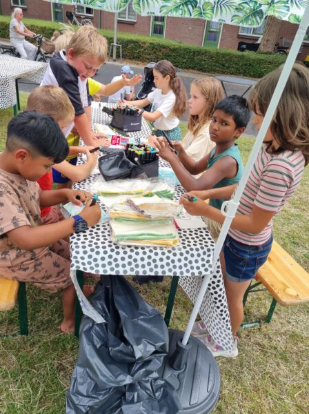 Er werden tafels en bankjes neergezet, er was een stormbaan en de kinderen konden etui’s versieren met textielstiften. Voor de kinderen was er limo en voor de volwassenen een frisje. De jeugd vermaakten zich allemaal op de stormbaan, dit werd begeleid door vrijwilligers en partners.