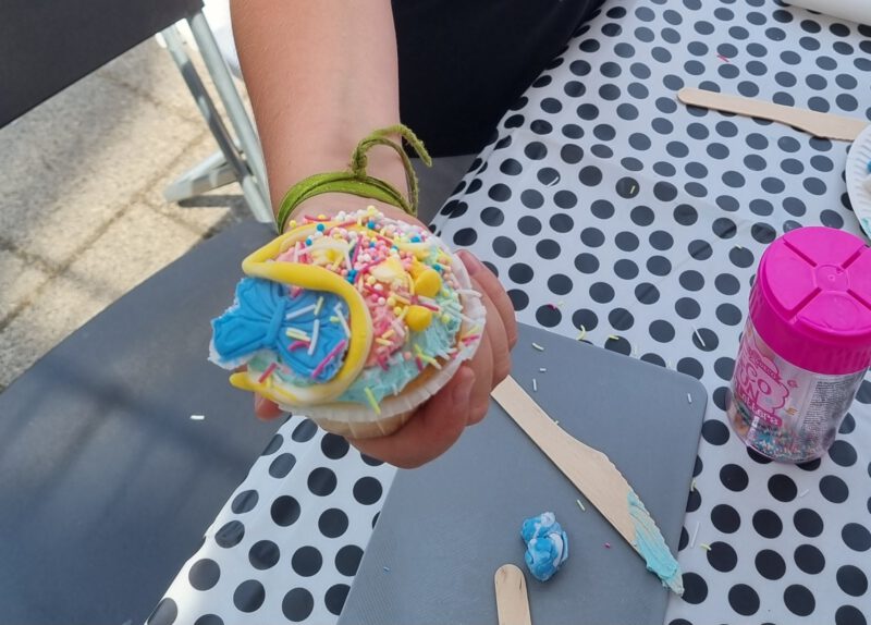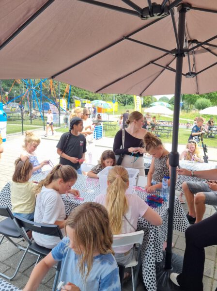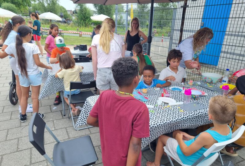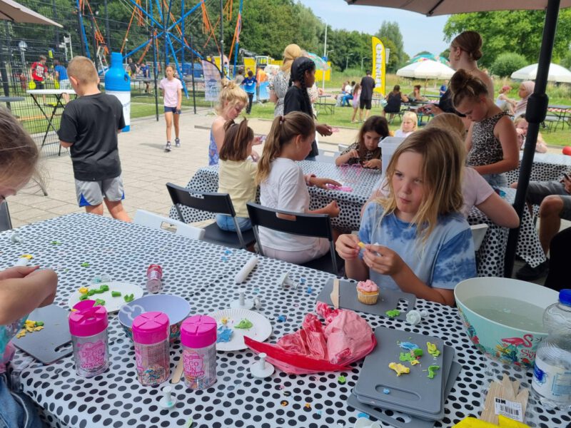 Bij de creatieve tafels konden de kinderen hun eigen cupcake en zonnebril versieren en ze konden een windmolentje mooi bekleuren met stiften.