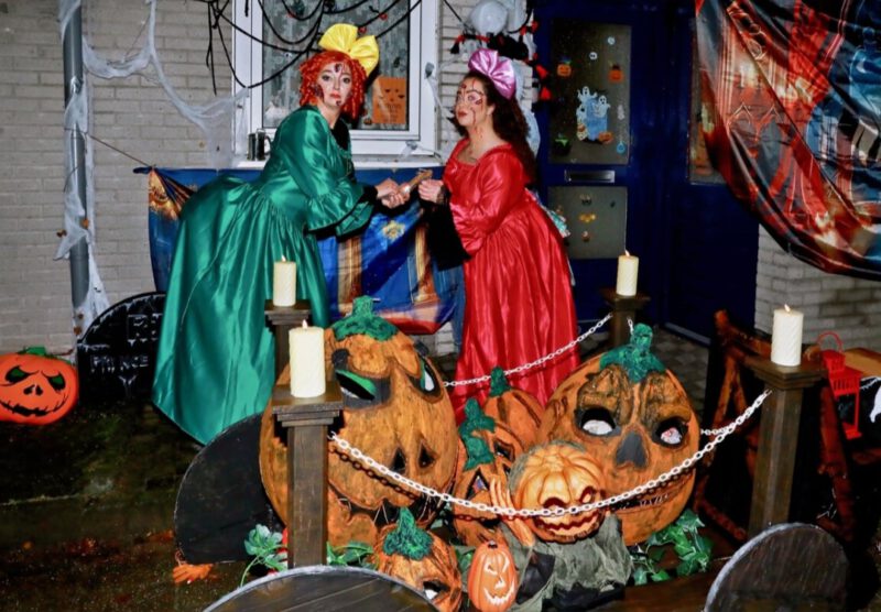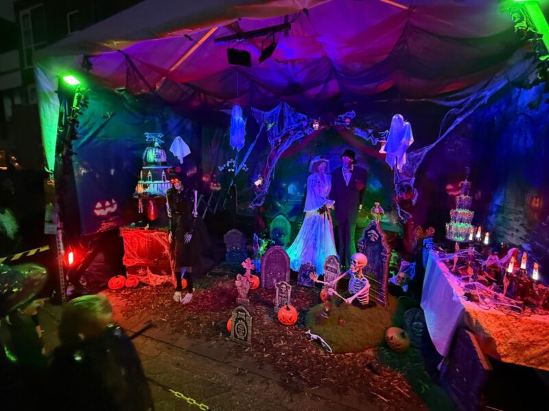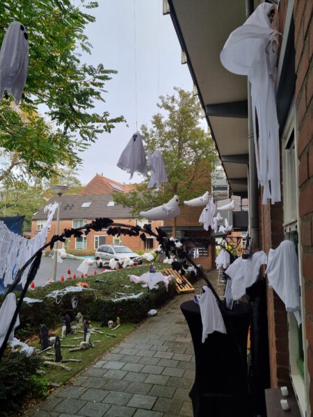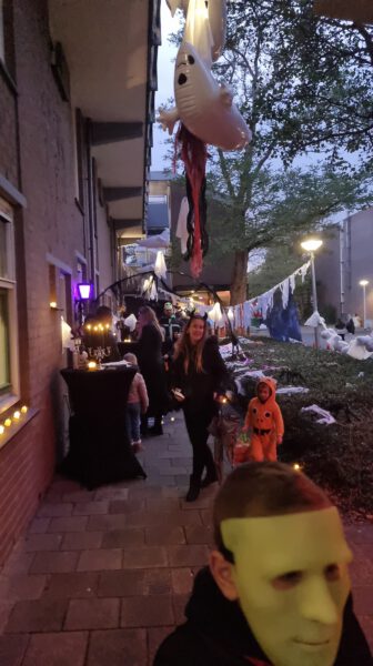 De wijk zat vol verklede bezoekers, griezelige versieringen en levendige activiteiten.